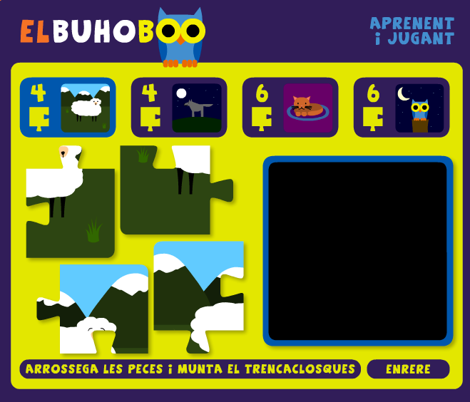Trencaclosques de 4 i 6 peces, on cal arrossegar les peces al lloc corresponent