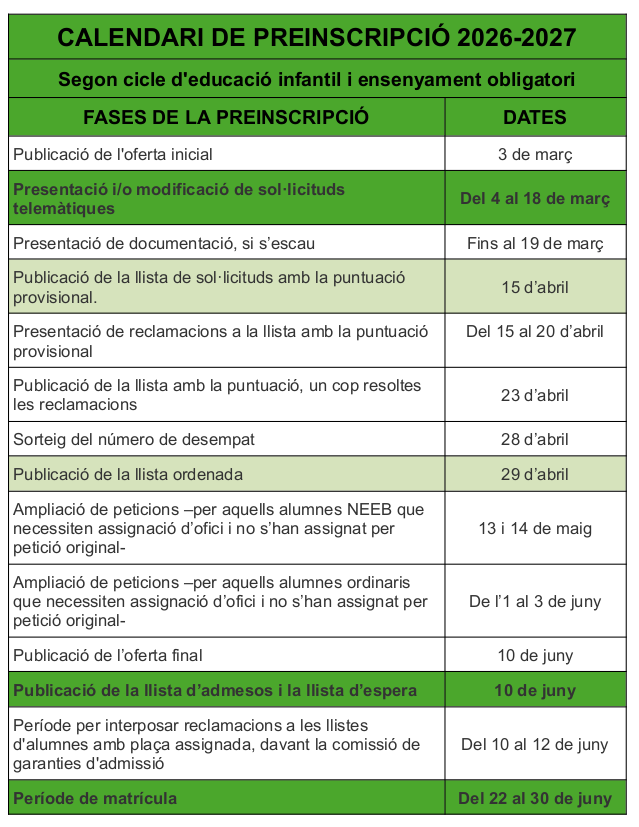 La sol·licitud de preinscripció s'ha de fer de forma telemàtica del 4 al 18 de març, però si alguna família vol que l'ajudem a omplir la sol·licitud, pot trucar a l'escola i l'atendrem.