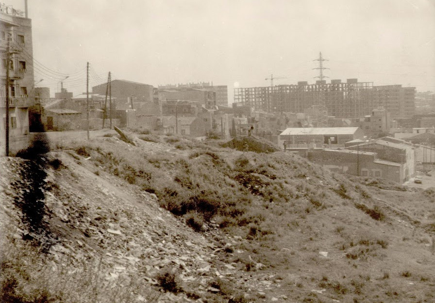 En aquesta foto es pot veure a primer terme un seguit de cases d'autoconstrucció del barri de Ca n'Oriac, i al fons les obres d'uns grans blocs de pisos.