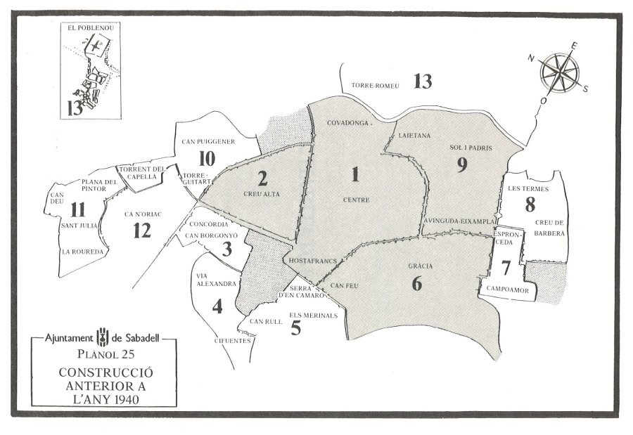 El nucli urbà constava bàsicament de quatre grans àrees: la Creu Alta, Gràcia, el Centre i l’Eixample. Aquestes grans àrees englobaven fins a 9 barris tradicionals. En aquest mapa podeu veure enfosquides les zones de l'actual Sabadell que formaven la ciutat abans de la Guerra Civil: