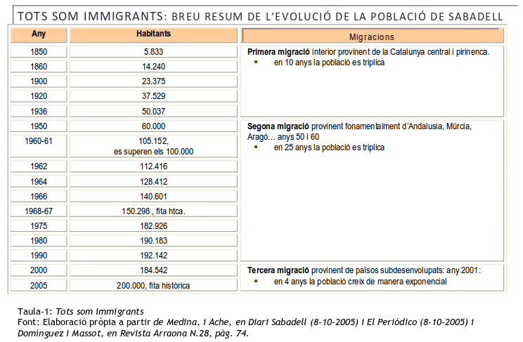 En el següent requadre podeu veure una evolució de la població de Sabadell des de 1850, i els moments en què aquesta creix degut a una onada migratòria.