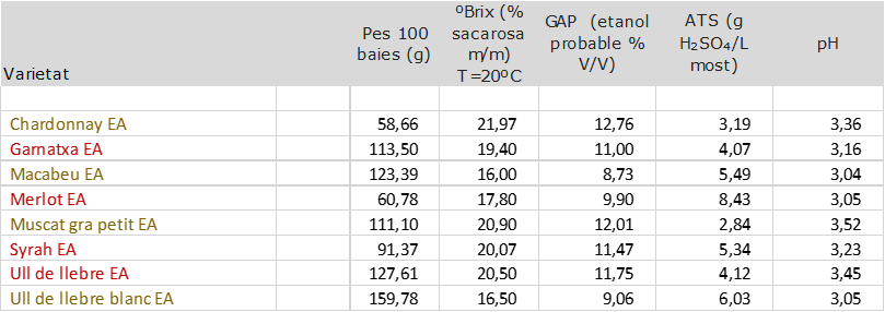 Avui s’ha realitzat el segon control de maduració del raïm de les vinyes de l’escola, a càrrec de Marcel Cama, Ferran Forn i Jordi Solé. Els resultats de l’anàlisi de 8 varietats, 4 de blanques i 4 de negres, s’exposen a la taula. El proper control es durà a terme el proper dilluns 14 d’agost.