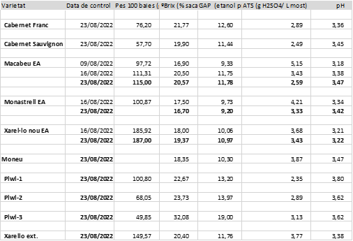 Avui 23 d'agost, els alumnes de 2n de Grau Mig d'Olis i Vins, Jofre Lluch, Laia Ramos, Marc Ramos, Emili Rossell i Erick Rubio han realitzat un control de maduració d'algunes varietats de raïm de l'escola.