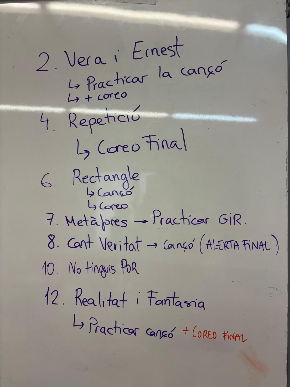 A música hem parlat de les cançons que podeu practicar a casa i hem fet una llista. Així que practiqueu el que hi ha a la llista i no cal fer més. Si podeu intenteu practicar la cançó sense mirar la lletra, per comprovar que us l'aneu aprenent.