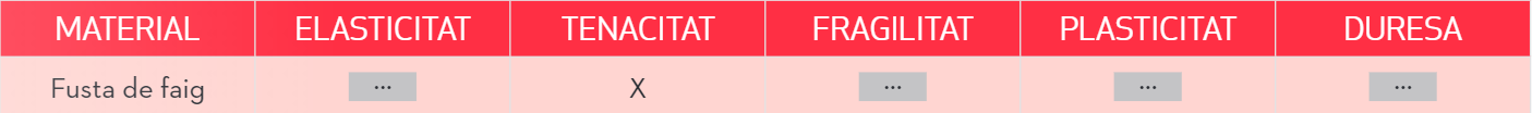 Completa la llista de materials amb: acer, alumini, vidre, plastilina, cautxú, plàstic (polietilè), paper i plom. Finalment, marca amb una creu les caselles d'acord amb les propietats més rellevants de cada material.