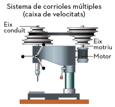 Per accionar un trepant de sobretaula com el de la figura es col·loca una politja de 150 mm de diàmetre en un motor elèctric. Aquesta politja s’enllaça mitjançant una corretja amb una altra politja, que té un diàmetre de 100 mm, solidària a l’eix del trepant.