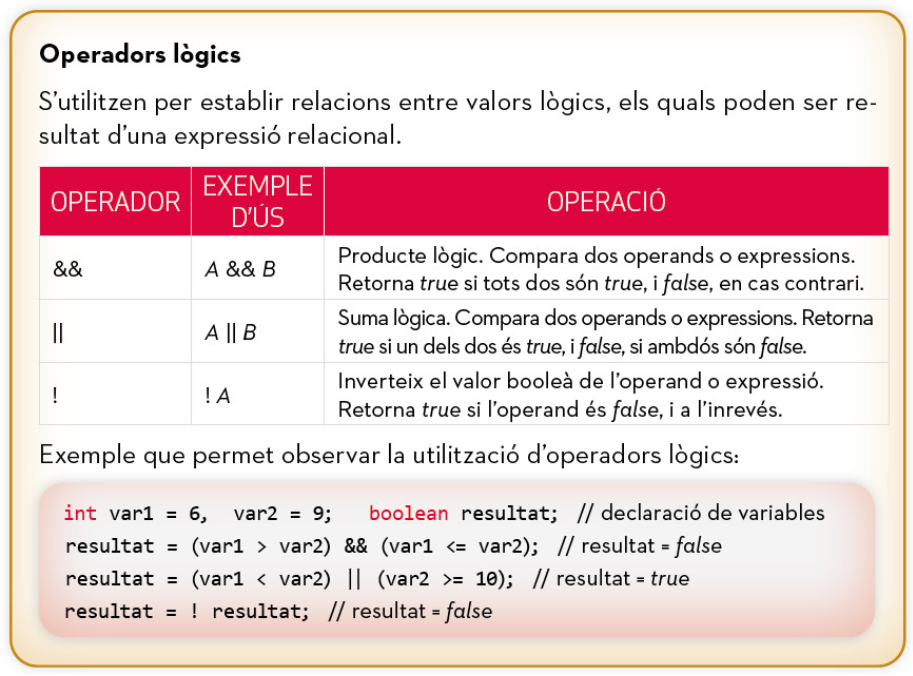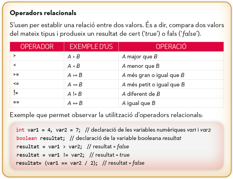 Els operadors són elements que permeten manipular valors: realitzar operacions matemàtiques o lògiques, comparar dades o establir relacions entre valors de variables i/o constants.