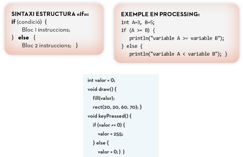 El tipus d’estructura condicional més conegut i utilitzat és «if… then… else…» (si… llavors… sinó). L’estructura «if» ens permet elegir si s’executa o no un bloc d’instruccions i, per tant, prendre decisions en funció d’una condició. El bloc else (la condició no s’acompleix) és opcional.