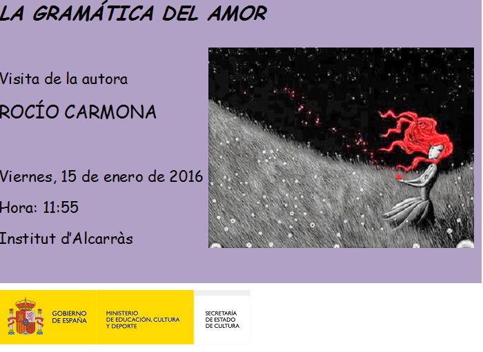 Xerrada literària per Administrador/a IES Alcarràs - dilluns, 11 de gener 2016, 10:41 Nombre de respostes: 0 Aquest divendres visita l'alumnat de quart d'ESO l'autora Rocío Carmona, autora de La gramática del amor. Enllaç permanent
