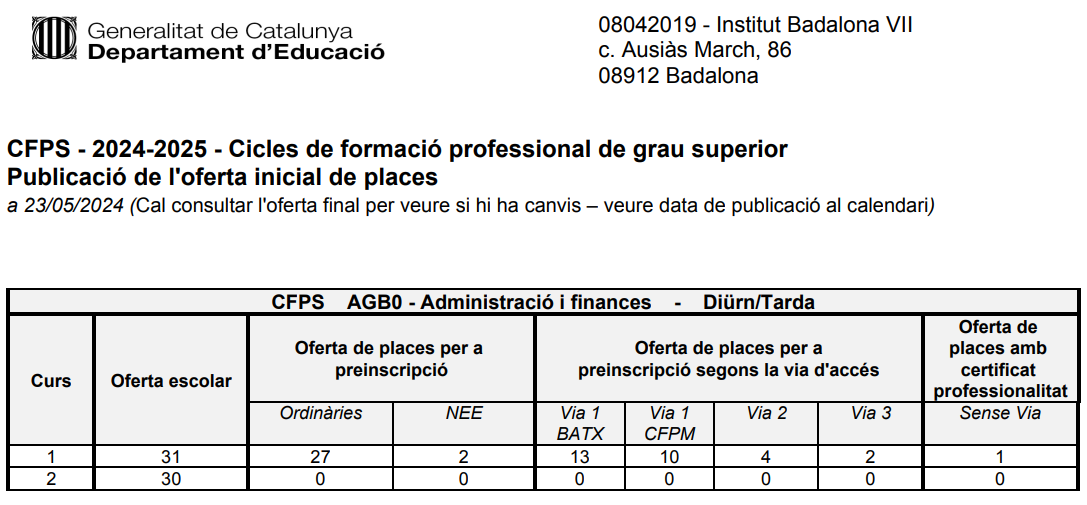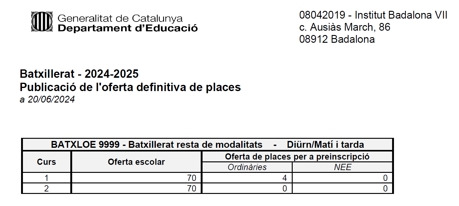 Llista d'alumnes admesos i llista d'espera el 10 de juny.