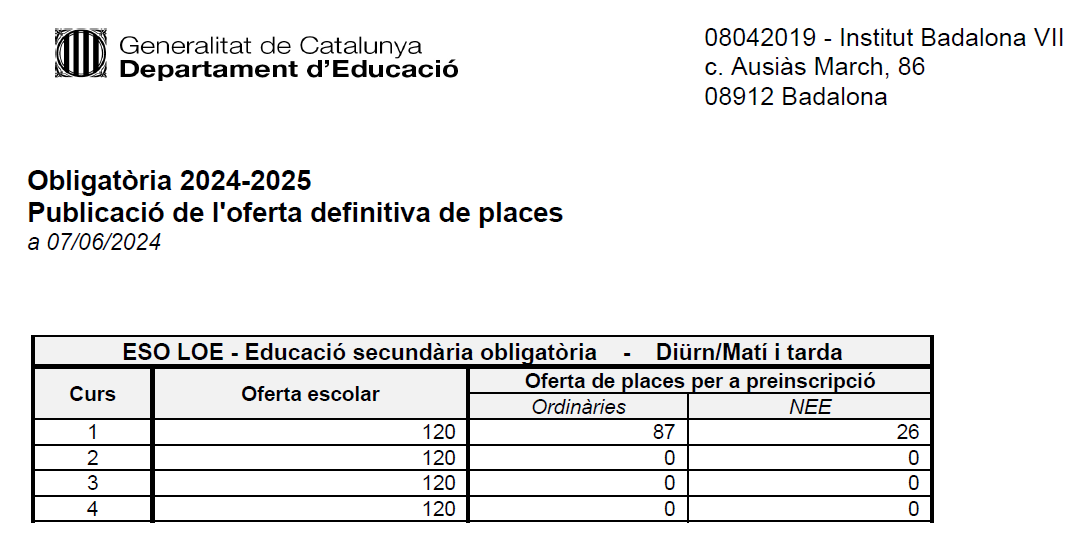 Oferta final de places escolars el 7 de juny: