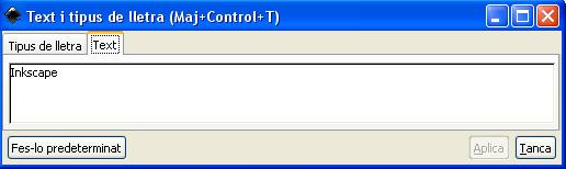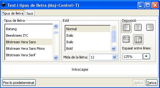 Para cambiar la familia de fuente, estilo, tamaño y alineación, seleccionamos el texto a cambiar y del Menú "Text" abra el dialogo "Text i tipus de lletra" (Mayus+Ctrl+T), y aparece el cuadro de diálogo: