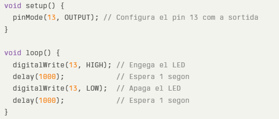 ⚙️ setup() → s’executa una sola vegada al principi. S’executa només una vegada en iniciar el programa. Aquí s’hi configuren els pins com a entrades o sortides, així com altres inicialitzacions que necessiti el projecte, per exemple començar la comunicació sèrie.