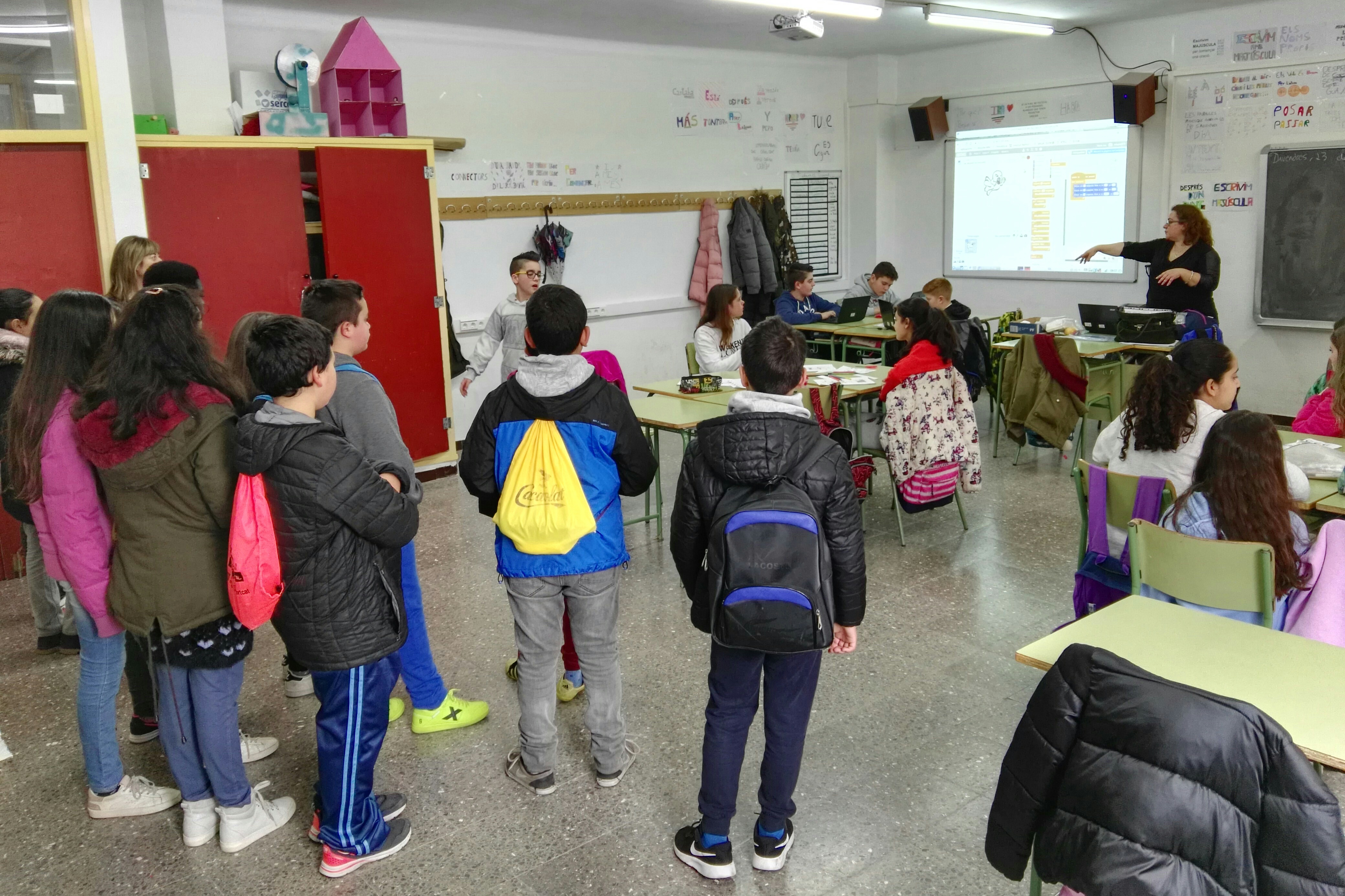 A l’arribada a l’institut, després de la rebuda feta per la Direcció, els alumnes de primària han entrat a les classes de 1r d’ESO on les professores i alguns alumnes els han explicat com treballem per projectes i han pogut preguntar tots els dubtes que els anaven sorgint.