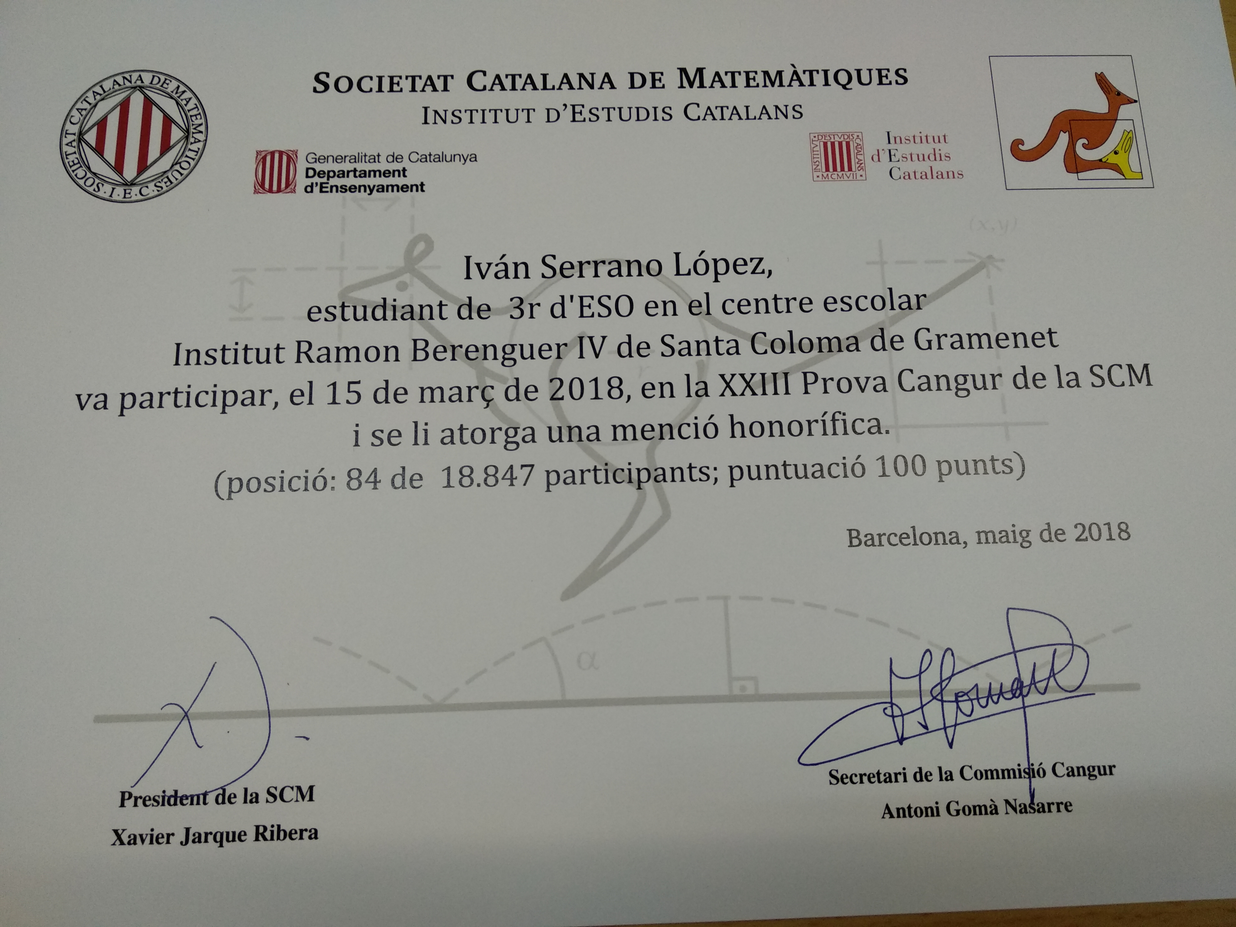 L'alumne Ivan Serrano de 3rB ESO ha quedat molt ben classificat a la Prova Cangur d'aquest any. De fet li han fet una menció honorífica.