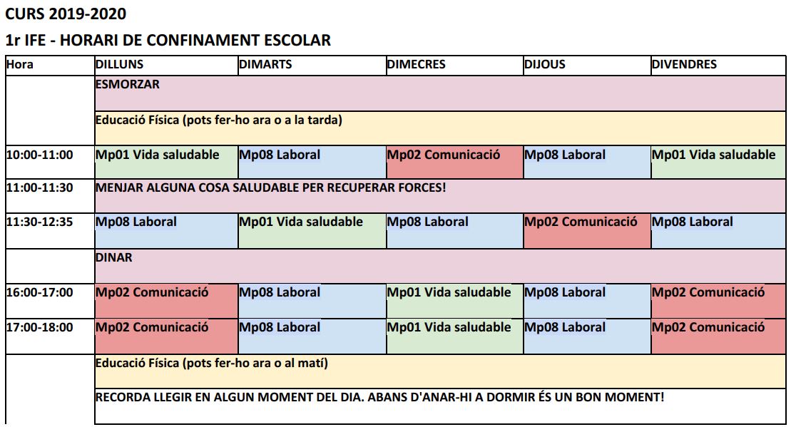 Tal com vam començar a fer amb altres nivell us compartim l'horari que proposem seguir a l'alumnat de l'FE, elaborat pels seus professors.